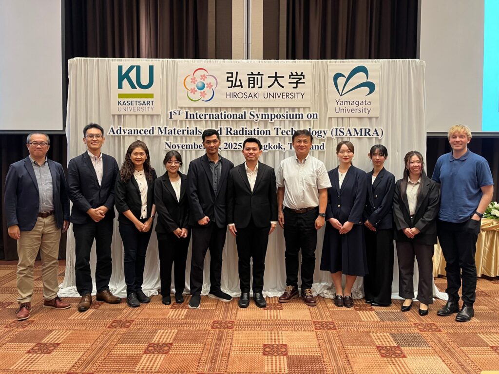 The 1st International Symposium on Advanced Materials and Radiation Technology (ISAMRA) was organized by the Special Research Unit of Radiation Technology for Advanced Materials (RTAM), which led by Assoc. Prof. Dr. Kiattisak Saenboonruang (Head of RTAM) and Assoc. Prof. Ekachai Wimolmala (Advisor of RTAM), on 10th November 2025, at Surasak 2 & 3 (11th floor), Eastin Grand Hotel Sathorn, Bangkok. This event provided a collaboration with the Kasetsart University Institute for Advanced Studies (KUIAS), Hirosaki University from Japan, and Yamagata University from Japan.